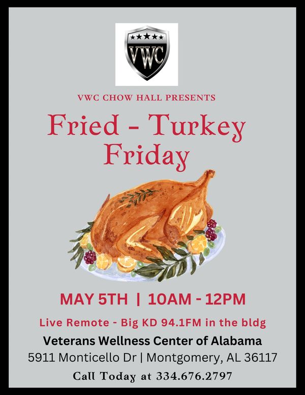 Enjoy delicious turkey, connect with others, and catch the 94.1FM live remote broadcast. This veteran-focused event in Montgomery happens once a quarter—come out, relax, and mingle with everyone.